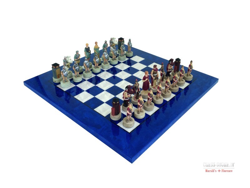 GRECI CONTRO ROMANI: Scacchi in Resina Pitturata a mano + Scacchiera in Radica di Erable, intarsiata