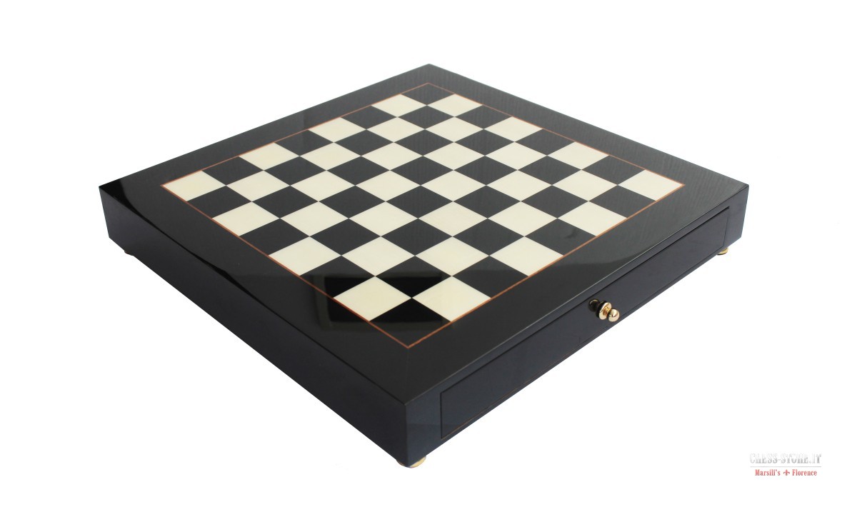 SCACCHIERA IN RADICA DI ERABLE NERA CON CASSETTO E PIEDINI DORATI