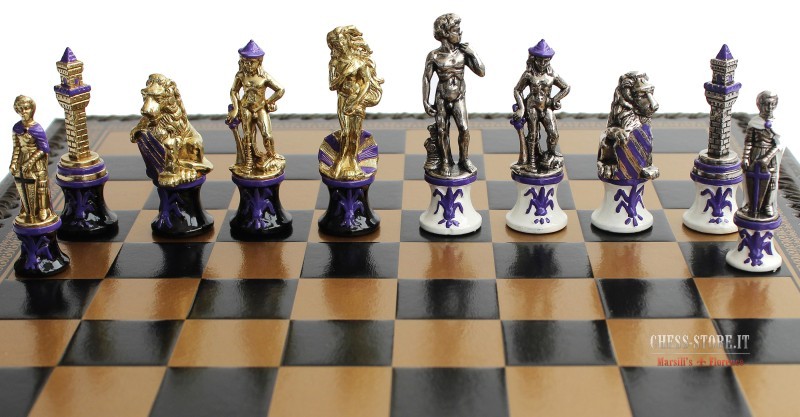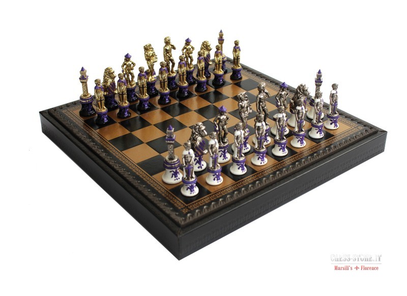 Scacchi in Resina Pitturata a mano + Scacchiera in Similpelle con contenitore per scacchi