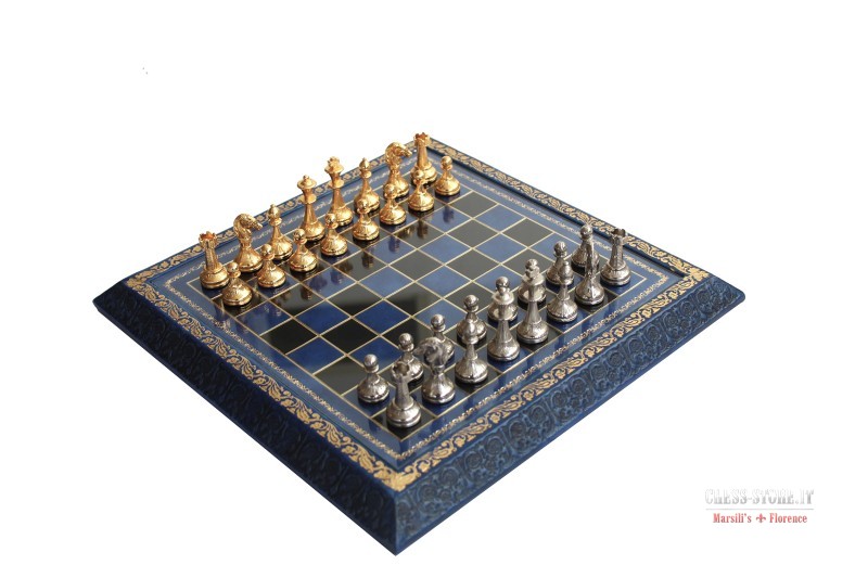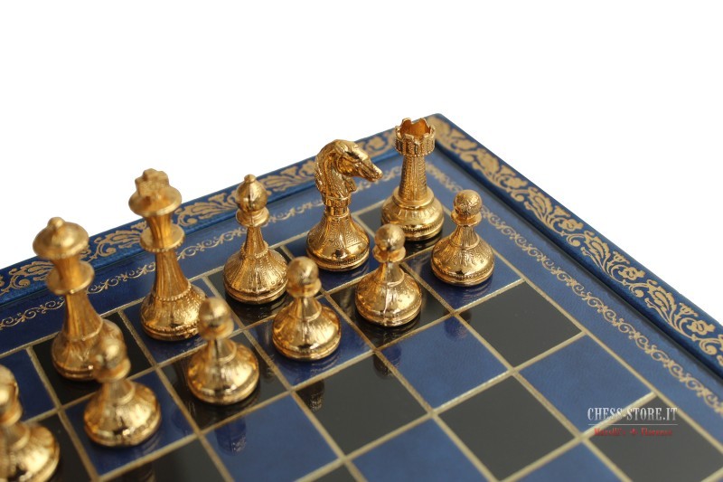 Scacchi in Metallo Dorati e Agentati + Scacchiera in Legno con cornice in Similpelle