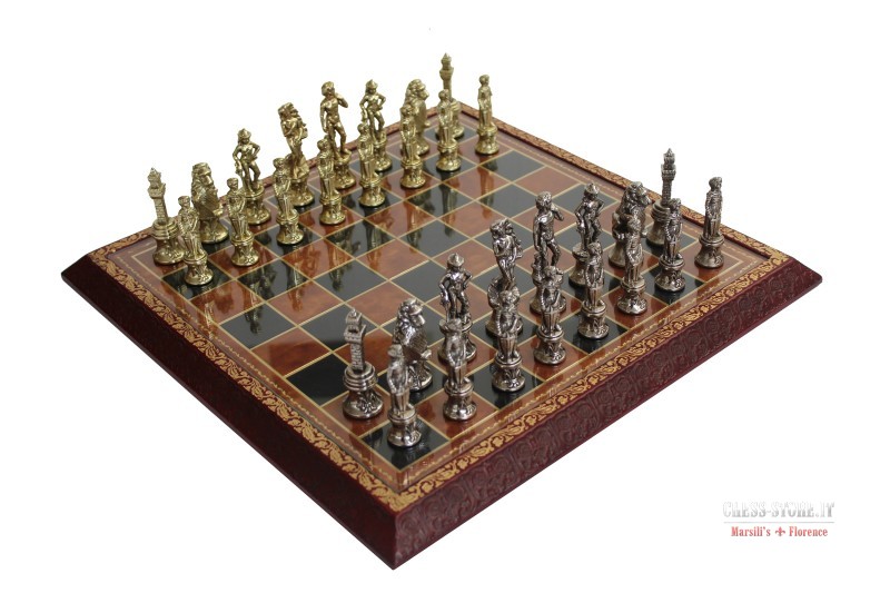 Scacchi in metallo + Scacchiera in vera pelle con top in vetro